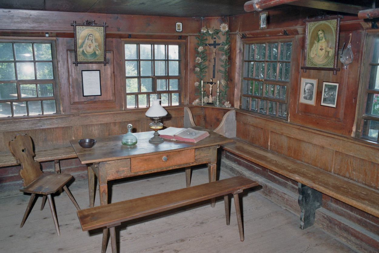 Der Schniederlihof hatte keinen Kamin, zu kostbar war der Rauch, der durch das Herdfeuer in der "Kuchi" entstand: Er zog um die Balken nach oben in den Dachraum, räucherte in der Räucherkammer Speck und Würste und imprägnierte auf seinem Weg nach oben das Holz. Balken und Schindeln innen sind tiefschwarz.
