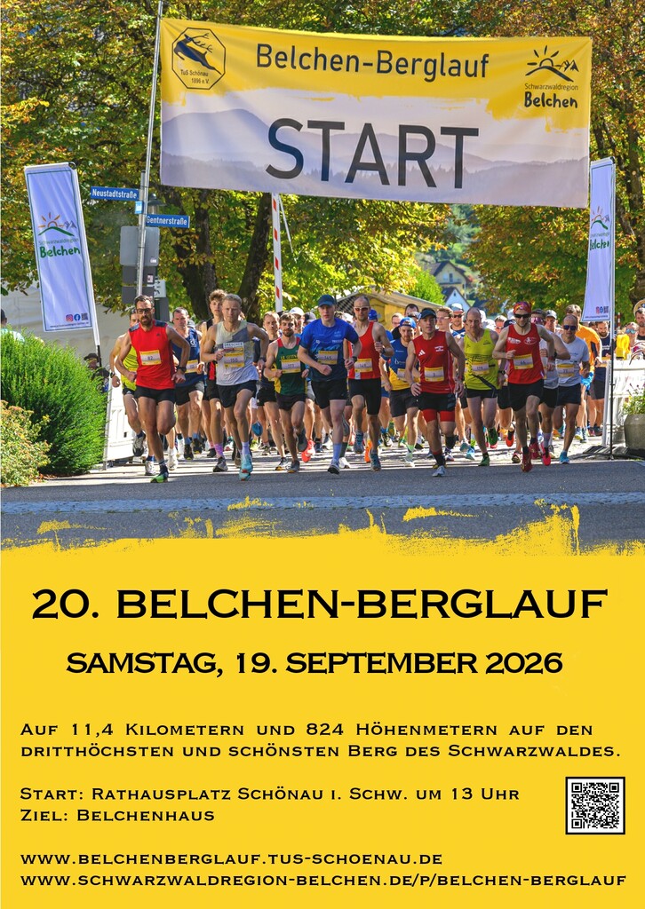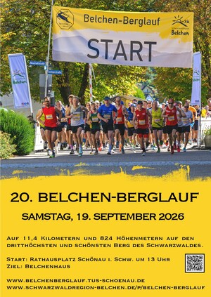 Der 20. Belchen-Berglauf findet am Samstag, 19. September 2026 statt. Die Strecke verläuft auf 11,4 Kilometern und 824 Höhenmetern vom Stadtzentrum von Schönau hinauf auf den 1.414 Meter hohen Belchen.