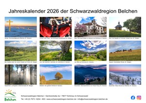 Der neue Jahreskalender der Schwarzwaldregion Belchen für 2026 ist erhältlich. Der Jahreskalender ist im DIN A3 Format gedruckt und beinhaltet mit dem Titelbild insgesamt 12 Aufnahmen, die von den Fotografen Werner Steiger und Klaus Hansen in der Schwarzwaldregion Belchen gemacht wurden.