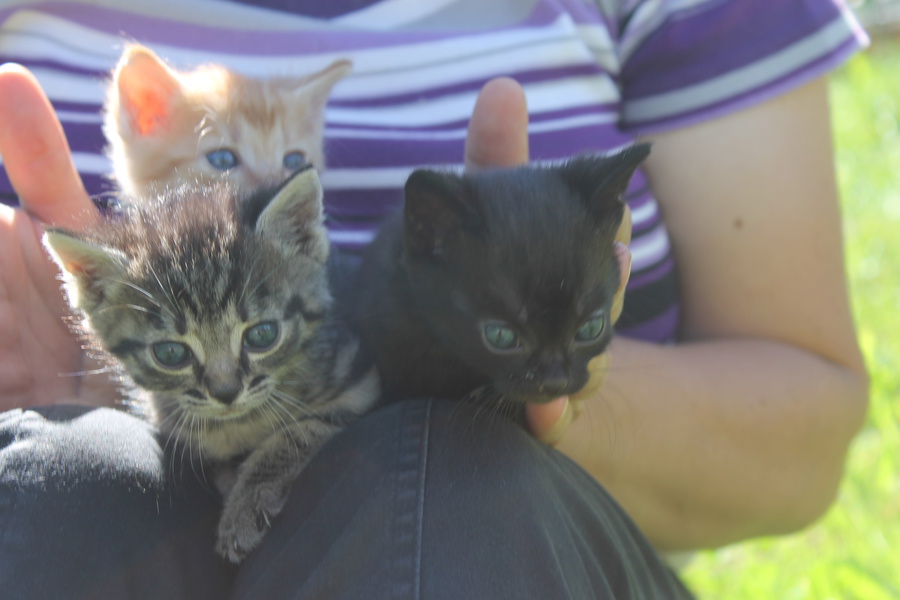 Katzen, Hasen, Hühner, Hahn, Meerschweinchen, Kühe und Kälbchen im Sommer.