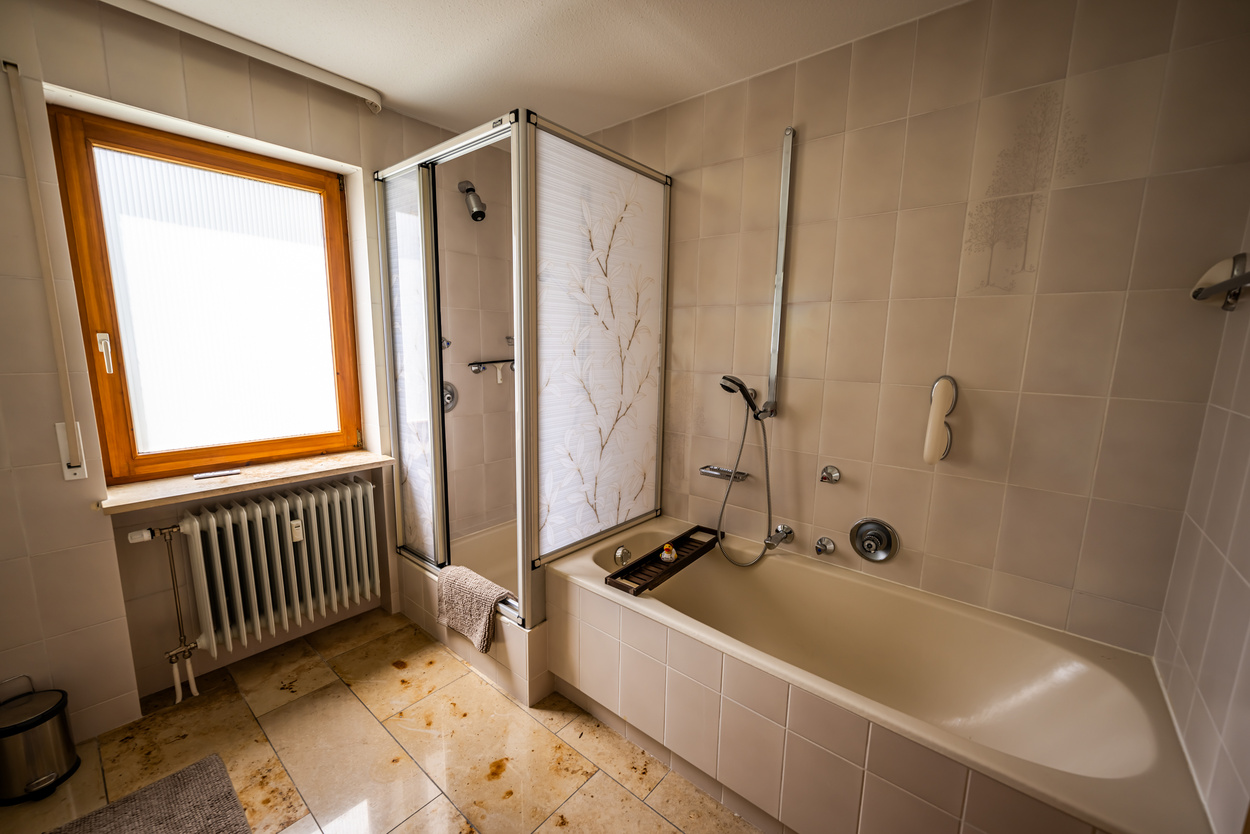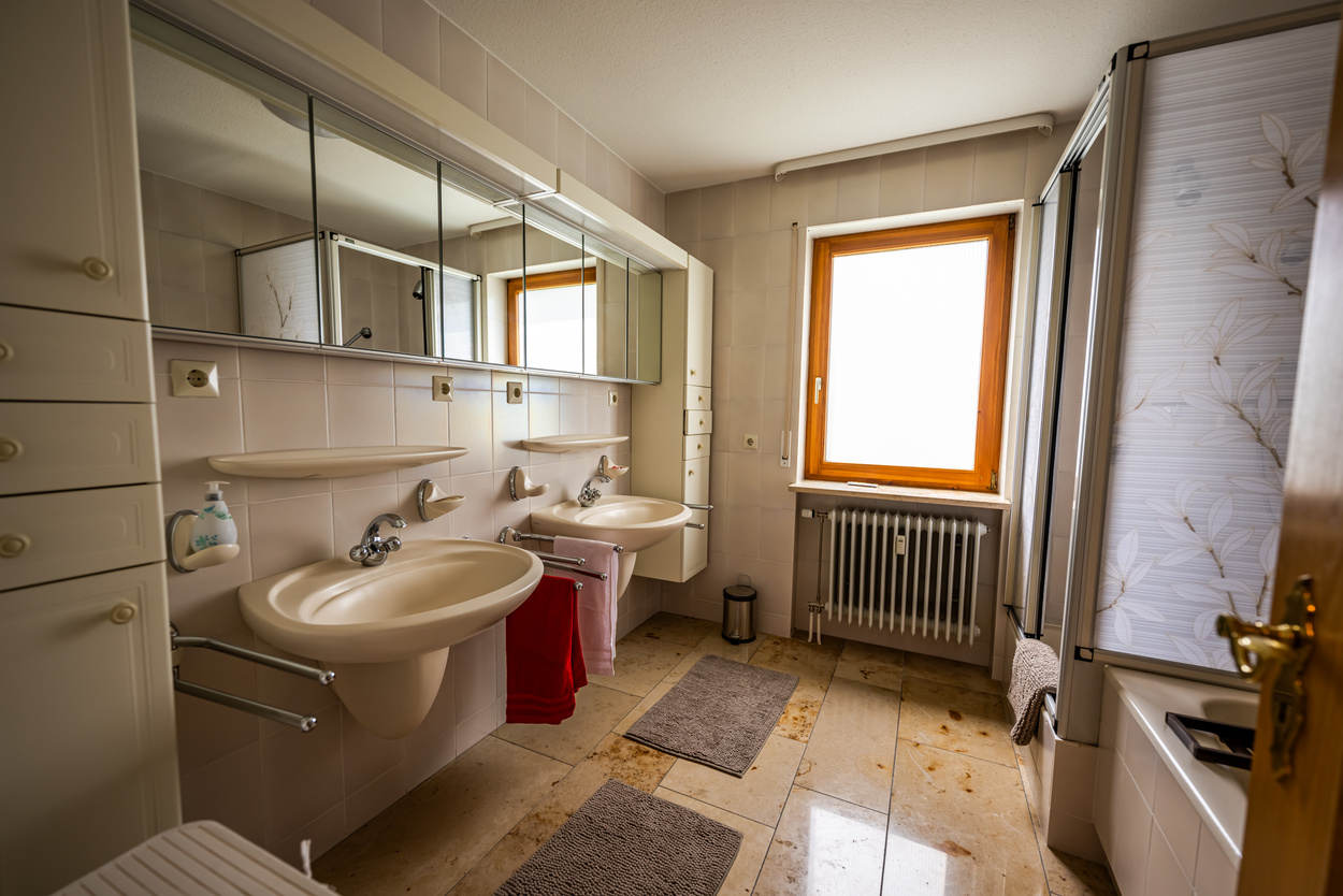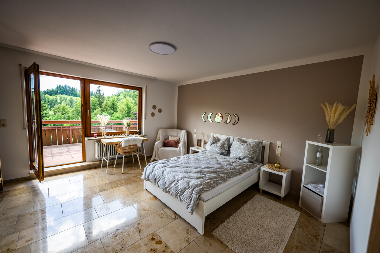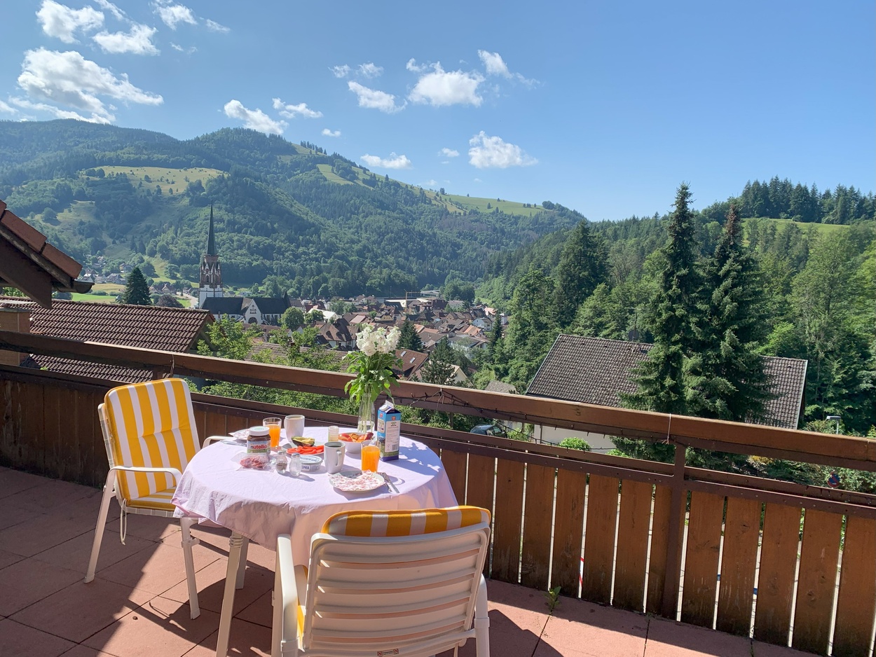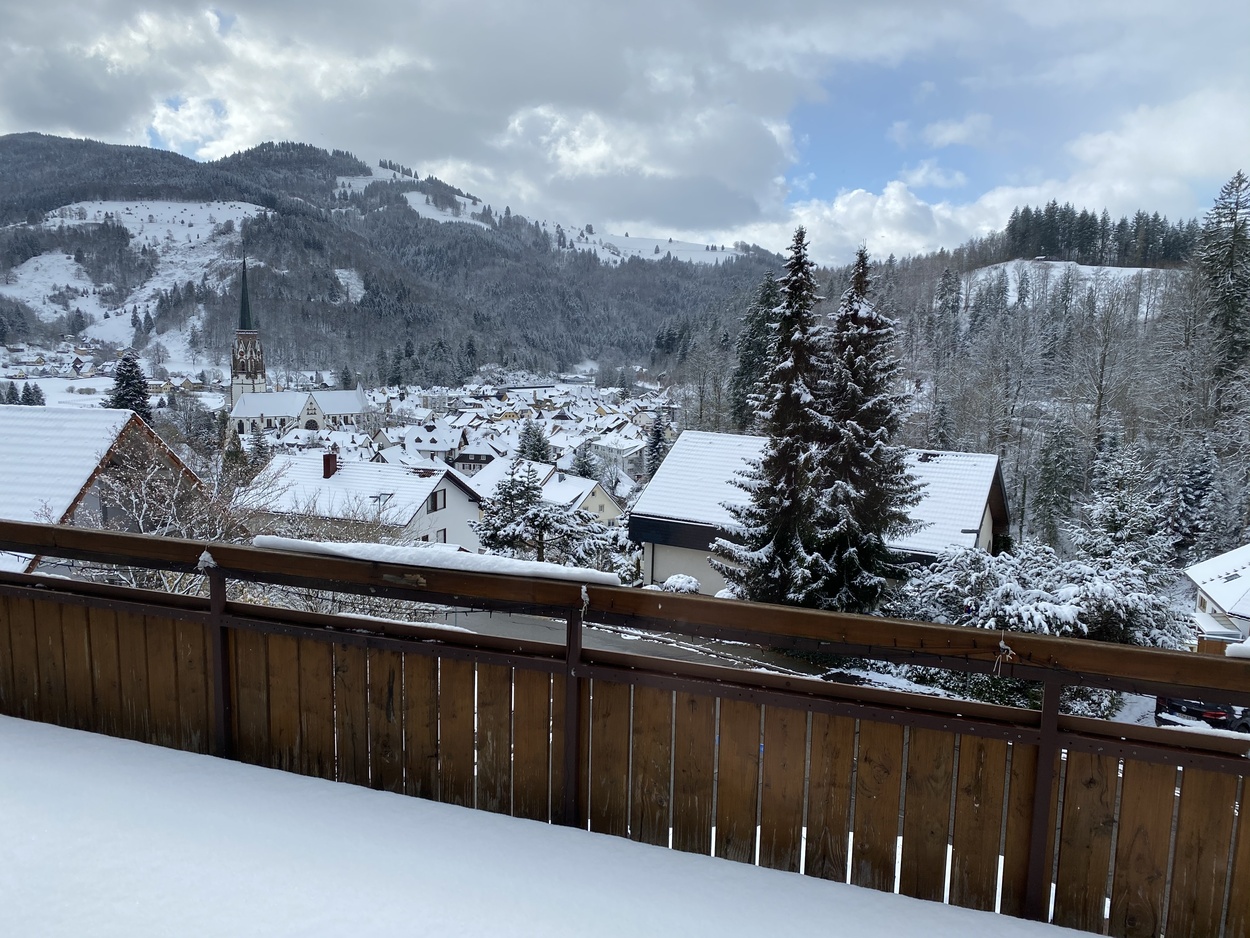 Schlafzimmer mit Doppelbett und Balkon  - Blick auf das Doppelbett im Schlafzimmer - Wohnzimmer mit Sofaecke  und Esstisch  - Wohnzimmer mit Sofaecke und Blick auf den Balkon  - Wohnzimmer mit Esstisch und Sofaecke  - Blick auf den Balkon  - Doppelbett eines Schlafzimmers - Das weitere Schlafzimmer mit Doppelbett  - Blick in den Flur der Wohnung  - Das Badezimmer mit zwei Waschbecken und Fenster - Dusche und Badewanne - Blick vom Flur auf zwei geöffneteTüren des Badezimmers und der WC-Türe - Die Toilette, separat vom Badezimmer  - Das Esszimmer mit Küche - Die Küche mit Holzschränken, Herd und Backofen - Toilette mit Waschbecken und Fenster  - Der Balkon mit Tisch und Stühlen sowie einer Sitzlounge  - eine große Eck- Sitzlounge auf dem Balkon  - Blick vom Frühstückstisch auf dem Balkon auf Schönau und die umliegenden Wälder  - Die Wohnungseinteilung- Grundrissplan  - Blick vom Balkon auf den orangefärbten Abendhimmel über Schönau - Blick auf Schönau mit den umliegenden grünen Wälder und Hügel - Blick vom Balkon auf die verschneite Landschaft und Schönau  - Außenansicht des Hauses, die Wohnung befindet sich in einem Mehrfamilienhaus -