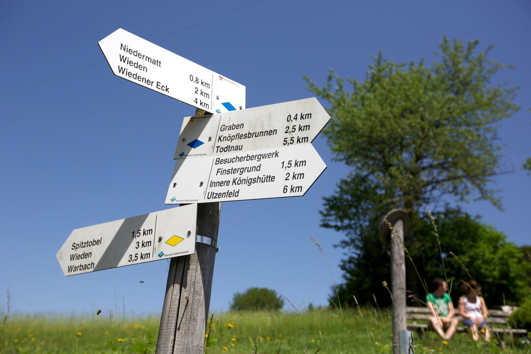 Wegweiserstandort in WiedenDas Planen und Markieren von Wanderwegen ist eine wichtige Kompetenz des Schwarzwaldvereins. Rund 24.000 km Wege und Pfade sind mit den farbigen Rauten des Schwarzwaldvereins ausgeschildert und ziehen ein engmaschiges Netz über den Schwarzwald und seine angrenzenden Regionen. Das Markierungssystem, das der Schwarzwaldverein im Jahr 2000 entwickelt und umgesetzt hat, ist im echten Wortsinn ein richtungsweisendes Konzept, das den Schwarzwald als einheitlich gekennzeichnete Wanderregion einzigartig macht. Mit dem ehrenamtlichen Engagement der zahlreichen Wegwarte und reichlich professionellem Know-How plant, markiert und pflegt der Schwarzwaldverein, gemeinsam mit den örtlichen Tourismusorganisationen, die Wege und Pfade für Ihr Wandervergnügen.