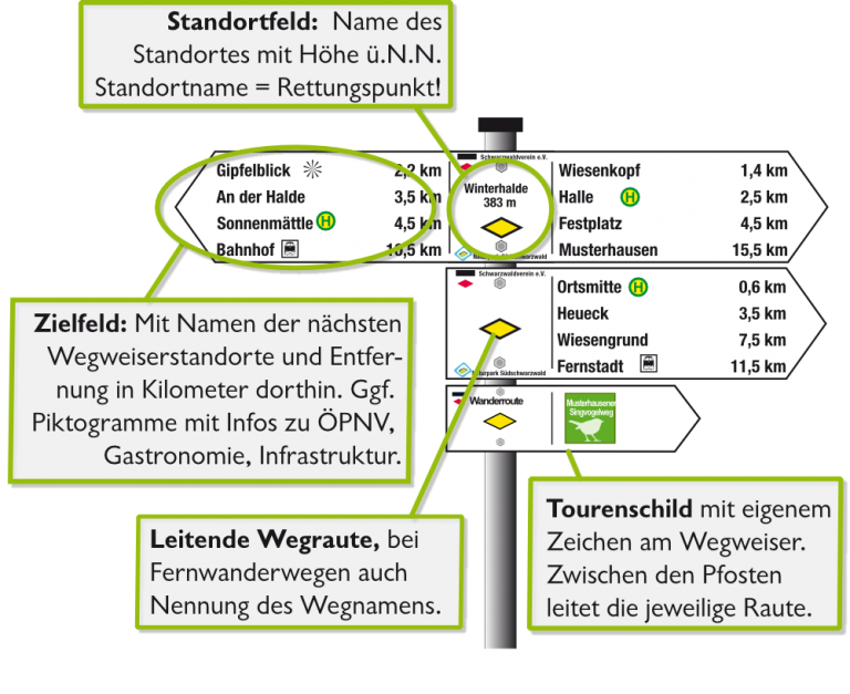 Zurück aber zur Basisbeschilderung: das Standortfeld des Basiswegweisers informiert über Standortname sowie Höhe und zeigt das Rautensymbol an, das zum nächsten Wegweiser führt. Ziele sind mit Entfernungen angegeben, das erstgenannte Ziel ist in der Regel der nächste Wegweiserstandort. Jedes genannte Ziel taucht auf dem jeweils folgenden Wegweiser wieder auf, bis es erreicht ist. Piktogramme geben zudem wertvolle Hinweise auf Einkehrmöglichkeiten, den ÖPNV oder besondere Aussichtspunkte.